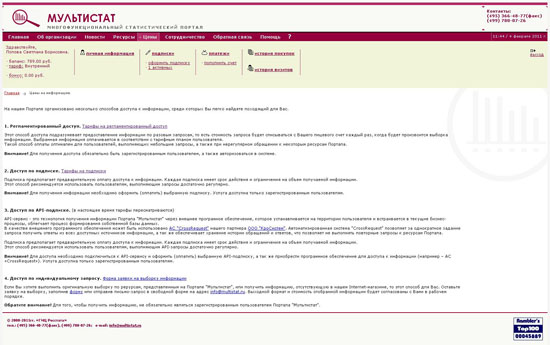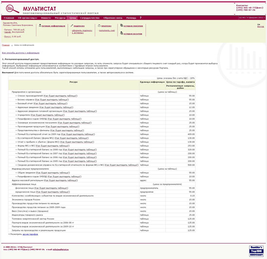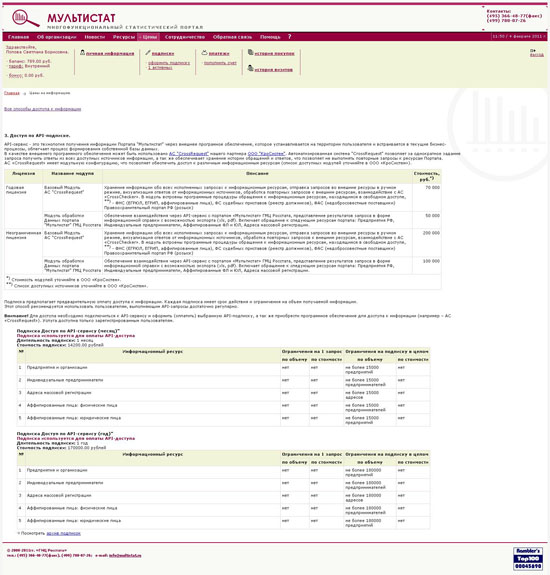 Раздел Цены знакомит пользователя Портала со способами доступа к информации. На странице раздела описаны все способы доступа к информации Порлата – бесплатный, регламентный, по подписке, регламентированный API-доступ и API-доступ по подписке. Первые три способа оплаты информации относятся к так называемому WEB-доступу, два последних - к API-доступу. Если ни один из предложенных вариантов доступа к инфорамции не устраивает пользователя, то он можен отправить Администрации Портала индивидуальный запрос. В этом случае, запрос будет обработан специальстами ГМЦ Росстата, стоимость будет согласована с пользователем в индивидуальном порядке по телефону или электронной почте. Для более полной информаци по Инвидуальному запросу см. пункт помощи Индивидуальный запрос. Для каждого из видов оплаты приводится краткое описание, позволяющее пользователю понять, какой из предложенных способов ему больше подходит. В описание также приводится краткая инструкция, как получить возможность оплачивать информацию именно этим способом. Для получения более полной информации по способу доступа необходимо перейти по ссылке справа от названия способа. Таблица тарифов содержит цены по всем ресурсам Портала, для которых допускается оплата по тарифному плану. Цены приводятся на единицу информации, конечная стоимость одного запроса зависит от объема отобраной по нему информации. Аналогично выводится цены на регламентированные API-запросы. Данная страница содержит все доступные подписки. Для каждой подписки указывается срок ее действия, стоимость, общие ограничения и индивидуальные ограничения по каждому ресурсу, включенному в подписку. Вывод информации об API-подписках производится по аналогии. |